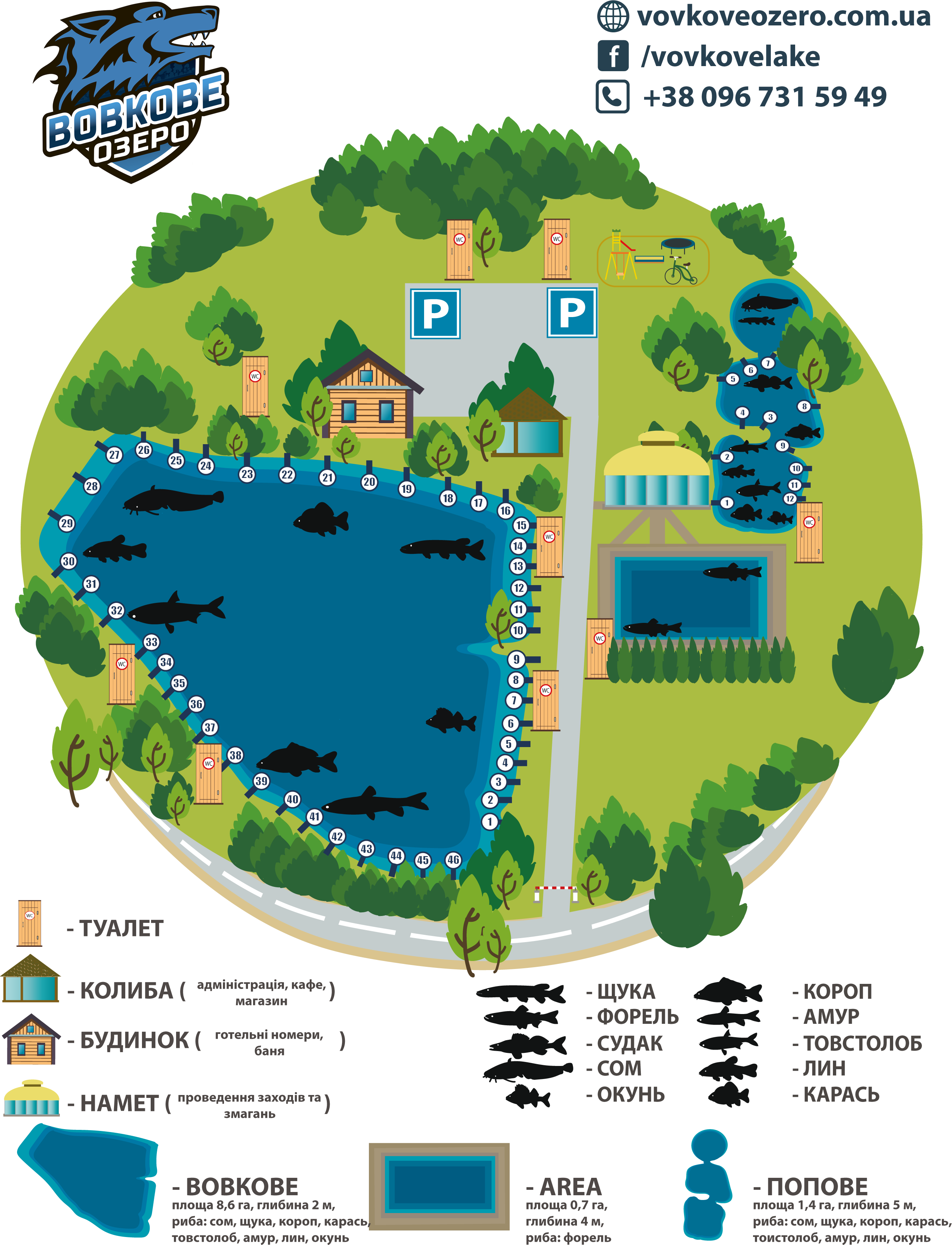 Риболовний комплекс «Вовкове Озеро» — ідеальне місце для відпочинку у Київській області. На території комплексу три водойми: Вовкове озеро зариблене щукою, сомом, судаком, окунем, коропом, білим амуром, карасем та товстолобом; Попове озеро з мирною та хижою рибою, де лов мирної риби дозволено на махові снасті; AREA Вовкове щільно зариблене фореллю, судаком та великим окунем. Комплекс пропонує комфортні умови з дитячим майданчиком, wi-fi, паркуванням, баньою, місцями для намету, літнім душем та номерами із зручностями.
